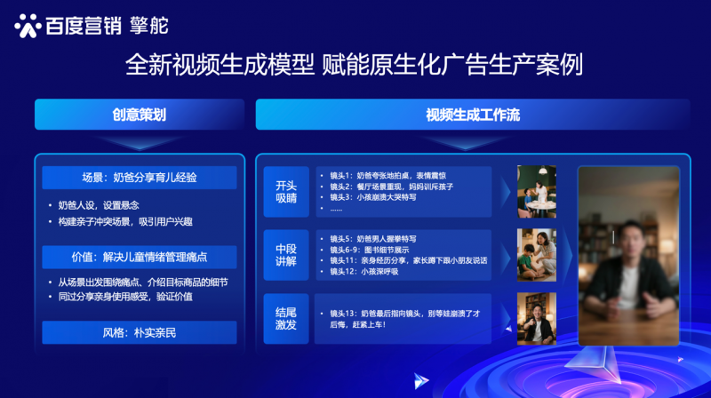 如今,依托百度視頻生成大模型取得的突破性進展,擎舵的核心能力也將實現(xiàn)升級。百度商業(yè)AIGC負責人韓聰表示,“擎舵正著力打造多智能體協(xié)作視頻生成 workflow,涵蓋編導、分鏡生成、后期處理等智能體,實現(xiàn)從劇本生成、分鏡設計到視頻特效處理的全鏈條智能化?!?同時,在廣告內容質量提升方向上,擎舵以 “高質量原生” 為方向,通過“有場景、有價值、有風格”的視頻與用戶建立信任感,引發(fā)用戶共情;以 “吸引 – 留存 – 轉化” 三段式劇本結構,通過融入真實生活場景、塑造鮮明人設,使廣告內容更具情感溫度。例如,在兒童繪本營銷場景中,通過構建 “奶爸” 人設和親子情緒管理沖突點的策劃,各智能體協(xié)同生成包含十余個分鏡的原生創(chuàng)意視頻。這種技術突破讓 “一個人就是一個影視隊伍” 成為可能,不僅顛覆了傳統(tǒng)廣告制作模式,更通過 AI 生成數(shù)字人、場景素材等功能,大幅降低模特、場地等生產成本,實現(xiàn)從 “硬廣” 到 “原生創(chuàng)意” 的質變。