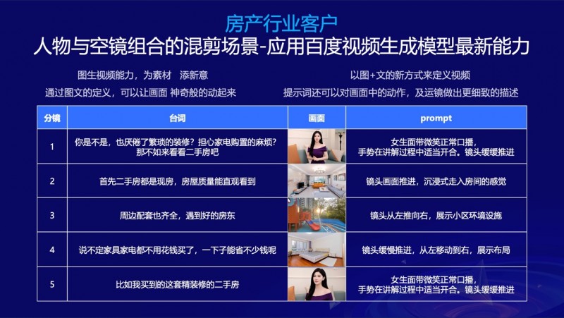 在百度視頻生成模型技術應用方面,周昀重點展示了其 “圖生視頻” 的顛覆性價值。例如,在房產行業(yè)中,通過分鏡腳本與靜態(tài)圖片輸入,可以生成動作精準、場景逼真的動態(tài)視頻,使靜態(tài)圖片 “動” 起來,營造沉浸式體驗;在游戲行業(yè)中,生成的人物跳舞片段動作幅度大、逼真度高,能大幅降低拍攝成本,推動廣告素材向原生化、智能化升級。展望未來,他表示將繼續(xù)依托擎舵技術,推動營銷行業(yè)邁向 “一杯咖啡時間完成創(chuàng)意生產” 的全智能化時代。