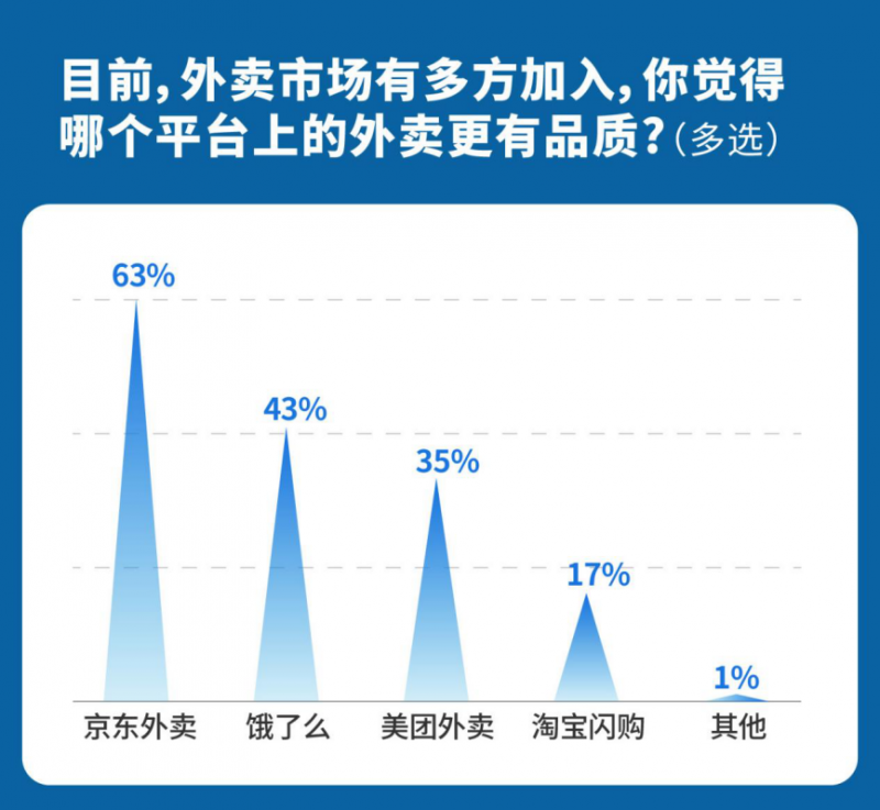 調(diào)查顯示,對于品質(zhì)外賣平臺的選擇,63%的用戶選擇了京東外賣,理由是京東一直與品質(zhì)掛鉤,要求更加嚴(yán)格。近30天來點品質(zhì)外賣時,有五成用戶主要選擇京東平臺。在北京、上海、廣州等10個重點城市,消費者點品質(zhì)外賣首選京東。在樣本涉及的77個城市中,消費者點品質(zhì)外賣首選京東的城市占比超60%。京東外賣的上述數(shù)據(jù)均大幅領(lǐng)先于其他平臺。
