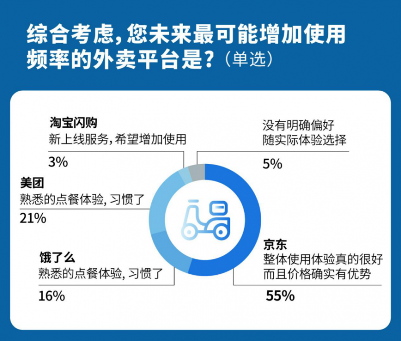如果外賣平臺強(qiáng)調(diào)“全職專業(yè)騎手配送”,45%的用戶會優(yōu)先選擇,“全職騎手讓我對配送服務(wù)更有信心”,還有43%的用戶表示,“會考慮,但還需要綜合比較價格、餐品等其他因素。”在騎手服務(wù)規(guī)范方面表現(xiàn)最突出的外賣平臺的選擇中,57%的用戶選擇了京東外賣,因為其有獨一無二的全職騎手團(tuán)隊,統(tǒng)一培訓(xùn)管理。