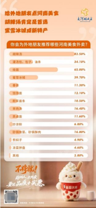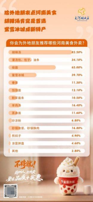 參與問卷調查的用戶很多不僅自己點外賣吃,當有親朋來河南時,不少用戶也會通過點外賣的形式,讓親朋品嘗河南美食。其中,胡辣湯(82.5%)、燴面(65.0%)、灌湯包(34.1%)是款待親朋時,出現在外賣菜單頻率最高的單品,甚至有39.7%的調研用戶,還會為親朋點一杯新晉“河南特產”蜜雪冰城當飯后甜品。