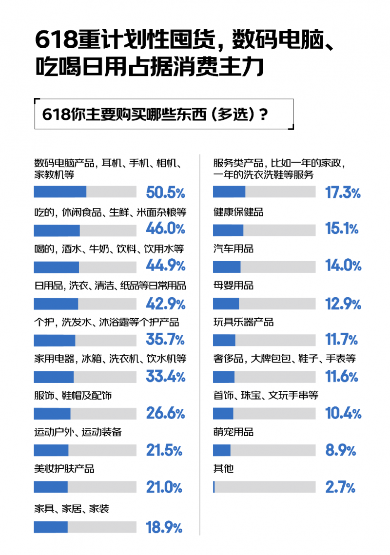 一年一度的618購物狂歡節,是消費者們清空購物車、囤積剛需的絕佳時機。調研顯示,數碼電腦以50.5%的比例成為618期間最被關注的品類,緊隨其后的是休閑食品、生鮮等吃的(46%),酒水、牛奶等喝的(44.9%)以及清潔、紙品等日常用品(42.9%)。對消費者而言,618大促是一場有計劃、有重點的“囤貨大戰”,大家瞄準的是能夠提升生活品質的耐用品或是生活必需、高頻消耗的日用品,消費行為呈現出極強的計劃性與目的性。