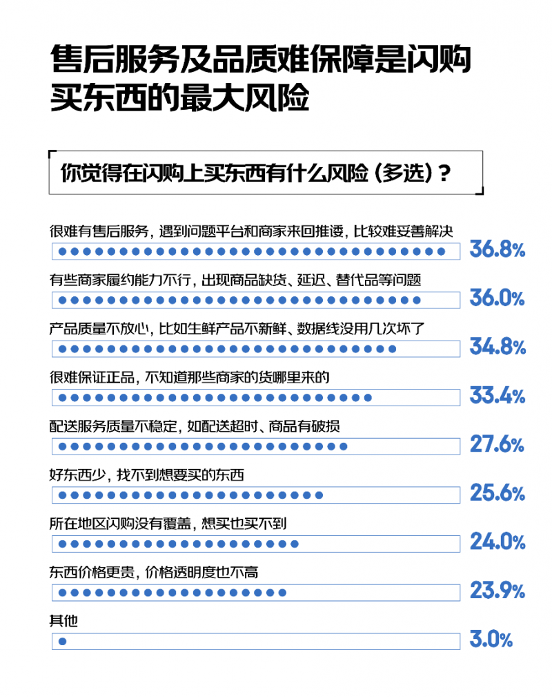 售后與品質問題,無疑是懸在閃購平臺頭頂的達摩克利斯之劍。調研顯示,36.8%的消費者認為閃購售后服務難保障,遇到問題時,平臺與商家相互推諉,讓消費者陷入漫長的維權拉鋸戰,既耗費時間又耗費精力;36.0%的消費者表示商家履約能力不行,商品缺貨、延遲交付等問題頻發,打亂了消費者的使用計劃;34.8%的消費者對產品質量心存疑慮,購買到的生鮮不新鮮、電子產品易損壞等狀況時有發生;33.4%的消費者擔心難以保證商品正品,尤其在購買知名品牌商品時,總是提心吊膽,生怕買到假貨。