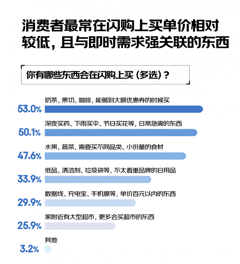 從品類來看,生鮮蔬菜水果、休閑零食、飲料、藥品保健品、蛋糕甜品是消費者最常在閃購上買的商品。具體而言,奶茶、咖啡等飲品是熱門選擇,尤其是在有大額優惠券可薅時,更是激發了消費者的下單欲望,占比達53.0%;深夜藥品、下雨買傘等日常急需品以及小份裝水果蔬菜也是消費者最常買的,分別占比50.1%和47.6%。消費者在閃購平臺上最常購買商品的共同特點在于單價相對較低,且與即時性需求緊密相連。
