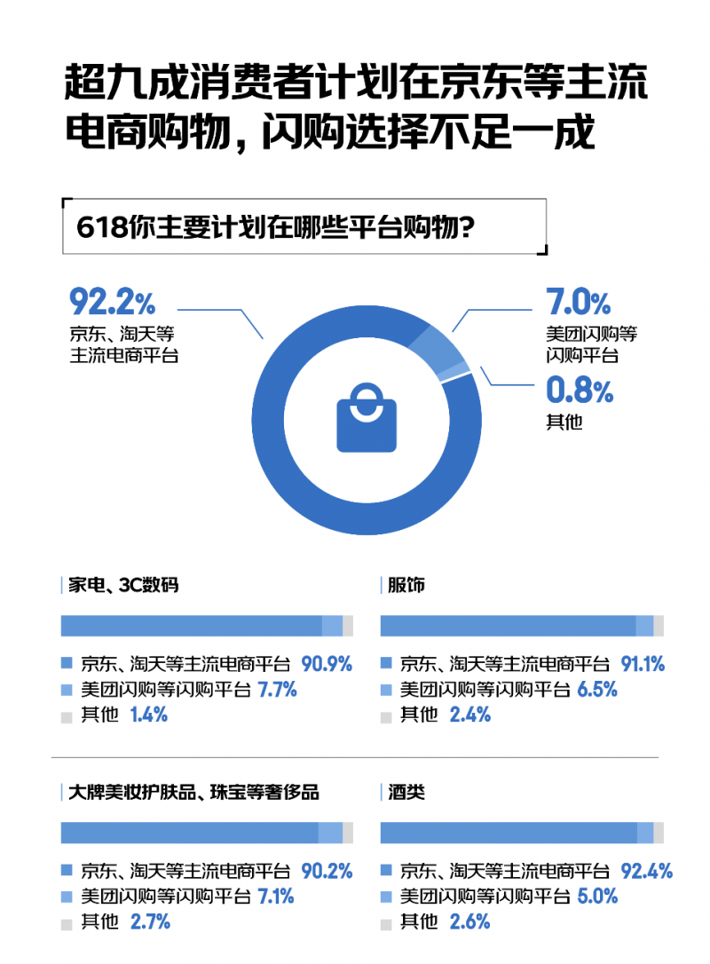 調研顯示,這個618,92.2%的消費者計劃在京東等主流電商平臺購物,會選閃購下單的占比不足一成。在具體品類上,90.9%的消費者更愿意在主流電商平臺買家電、3C數碼這類高客單價的產品,91.1%的消費者更愿意在主流電商平臺買服飾,90.2%的消費者更愿意在主流電商平臺買大牌美妝護膚品、珠寶等奢侈品,92.4%的消費者更愿意在主流電商平臺買酒類產品,89.4%的消費者更愿意在主流電商平臺買母嬰這類高信任感的產品。