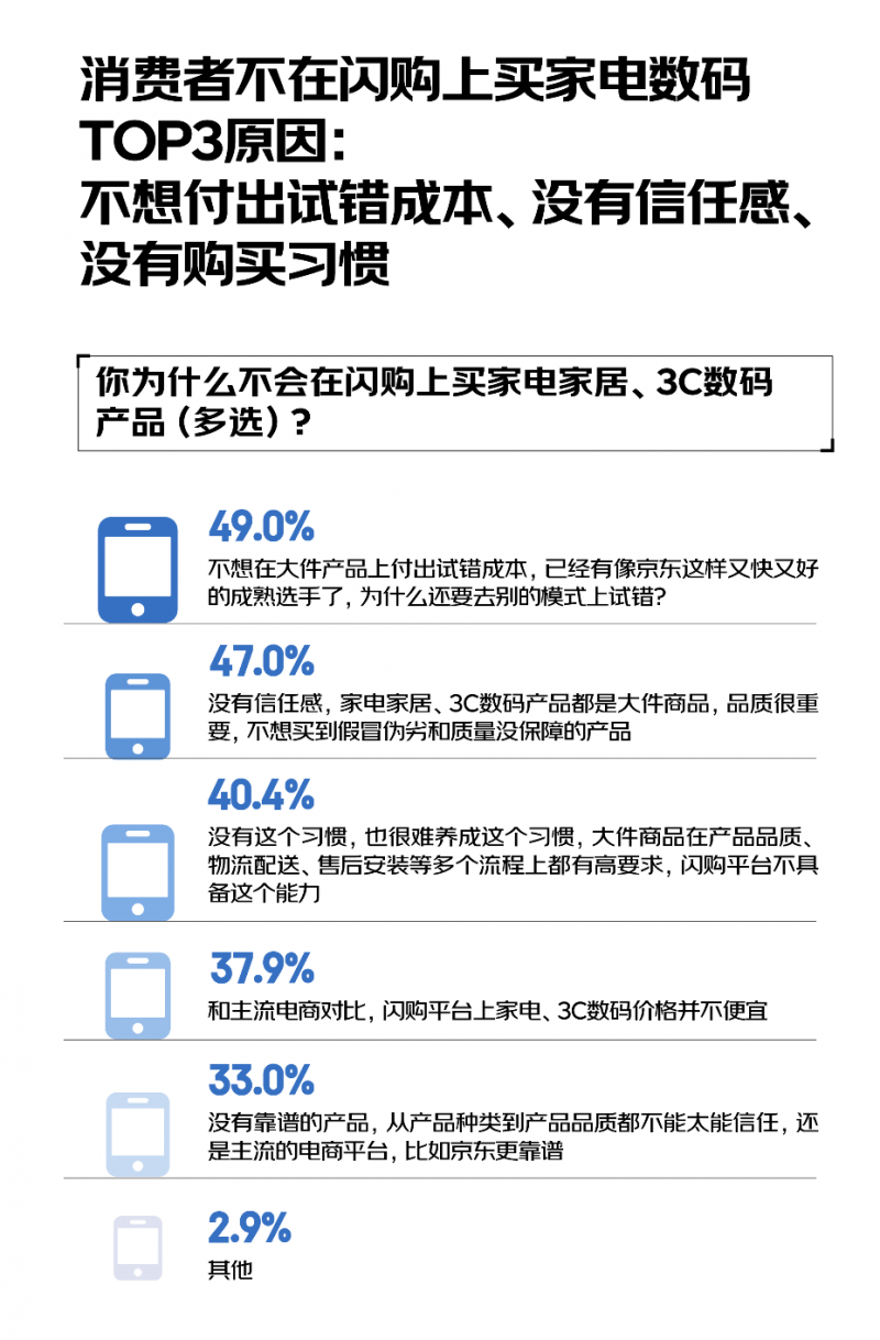 在家電家居、3C 數碼領域,消費者的顧慮更為突出,不想付出試錯成本、沒有信任感、沒有購買習慣是消費者選擇不在閃購上買的主要原因,合計占比65.7%。其中,49.0%的消費者不愿為大件商品承擔試錯成本,“已經有像京東這樣又快又好的成熟選手了,為什么還要去別的模式上試錯”。47.0%的消費者認為這些大件商品品質至關重要,而閃購平臺難以提供與之匹配的品質保障。即便有閃購平臺接入品牌門店甚至支持大家電送裝一體,消費者仍認為“手機電腦需官方售后”“大家電安裝依賴專業服務”——這些恰恰是京東等主流電商平臺深耕多年的護城河。