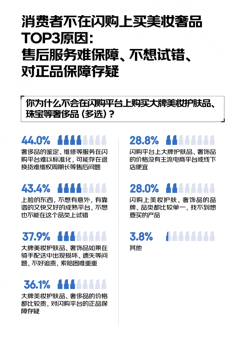 在大牌美妝護膚品、珠寶等奢侈品領域,有72.7%的消費者不在閃購上買是因為售后服務難保障、不想試錯和對正品保障存疑。其中,44%的消費者擔憂售后問題,如退換貨難、維權周期長等;43.4%的消費者出于對產品質量的考量,尤其是化妝品直接接觸皮膚,任何質量問題都可能對皮膚造成傷害,因此不敢在閃購平臺輕易下單。