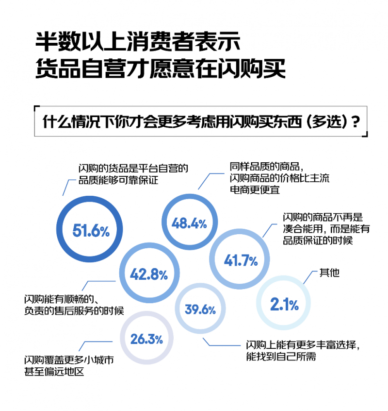 盡管電商新業態層出不窮,但消費者選擇購物渠道的“準繩”,依然是商品、價格、服務三者帶來的綜合體驗。調研顯示,貨品自營(51.6%)、同品質下商品價格更便宜(48.4%)、順暢負責的售后服務(42.8%)是消費者反饋未來是否會考慮用閃購買東西的核心因素。而閃購平臺引以為傲的“最快30分鐘送達”配送時效,除非在應急場景下,否則消費者并沒有特別強烈的需求,近八成消費者表示不會單因為配送速度快而更多選擇在閃購買東西。