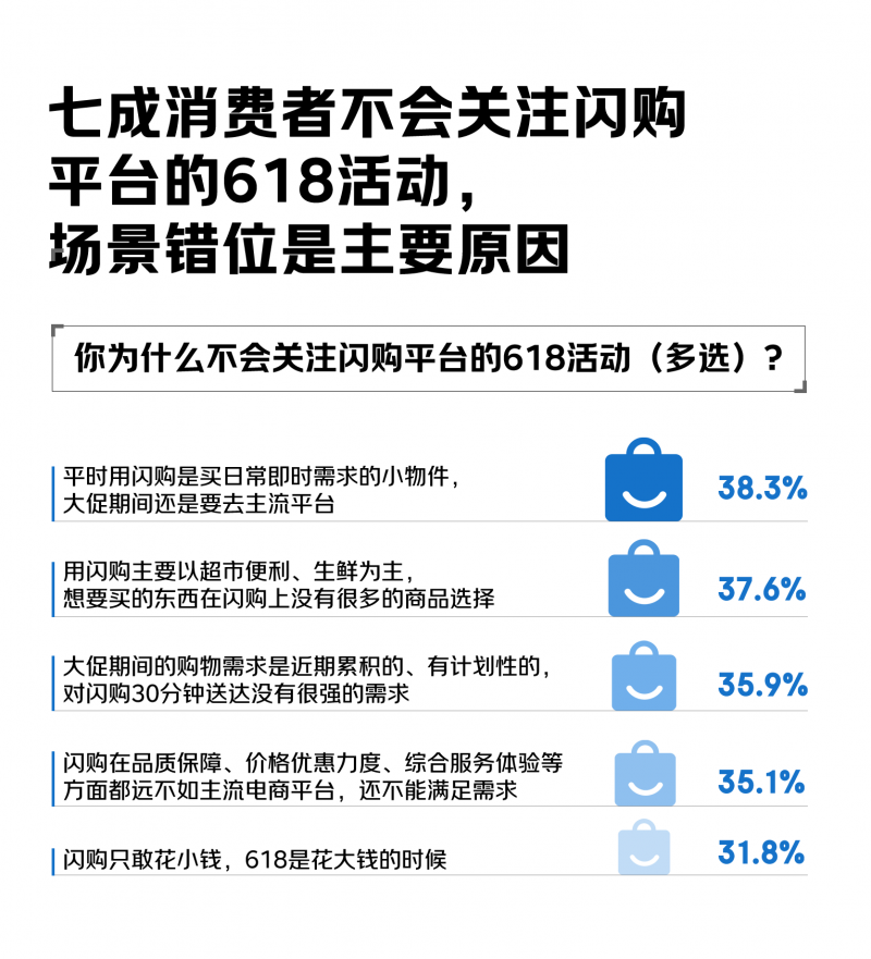 綜合各項調研結果,絕大部分消費者認為閃購無法在618大促中占據一席之地。57.3%的消費者指出核心矛盾:“閃購解決了‘快’的需求,但未突破‘多、好、省’,大促需要在送貨快、品類豐富度、品質保障、優惠力度、綜合服務體驗等各方面都優”。更有近五成受訪者表示:“對大部分商品,當日達、次日達已經能夠很好滿足需求了。”