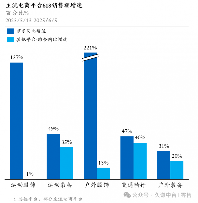 618期間京東持續(xù)精選高質(zhì)價(jià)比運(yùn)動(dòng)健身產(chǎn)品,覆蓋陸沖、馬術(shù)沖浪等新興小眾運(yùn)動(dòng)裝備品類,強(qiáng)化京東戶外運(yùn)動(dòng)產(chǎn)品“高專業(yè)性、高品質(zhì)”的消費(fèi)認(rèn)知,持續(xù)提升專業(yè)運(yùn)動(dòng)人群在京東平臺(tái)的消費(fèi)偏好度。此外還整合“國(guó)補(bǔ)”與“百億補(bǔ)貼”資源,推出“補(bǔ)上加補(bǔ)”活動(dòng),釋放價(jià)格優(yōu)惠勢(shì)能,銷售額增速顯著,戶外服飾品類實(shí)現(xiàn)221%的超高速同比增長(zhǎng),運(yùn)動(dòng)服飾品類增速127%,均遠(yuǎn)高于其他平臺(tái)綜合同比增速。
