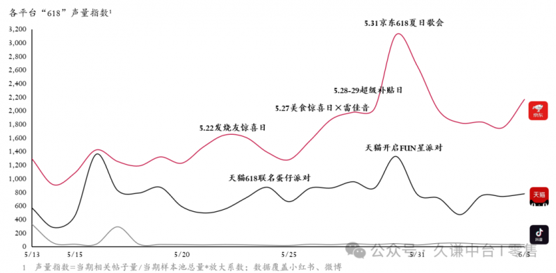 據(jù)久謙中臺(tái)數(shù)據(jù),在社媒聲量(覆蓋小紅書、微博)方面,京東憑借其高頻次、高創(chuàng)意的營(yíng)銷活動(dòng)實(shí)現(xiàn)了全平臺(tái)領(lǐng)先,消費(fèi)者感知度顯著提升。這為其后續(xù)的銷售爆發(fā)奠定了堅(jiān)實(shí)的流量基礎(chǔ)。