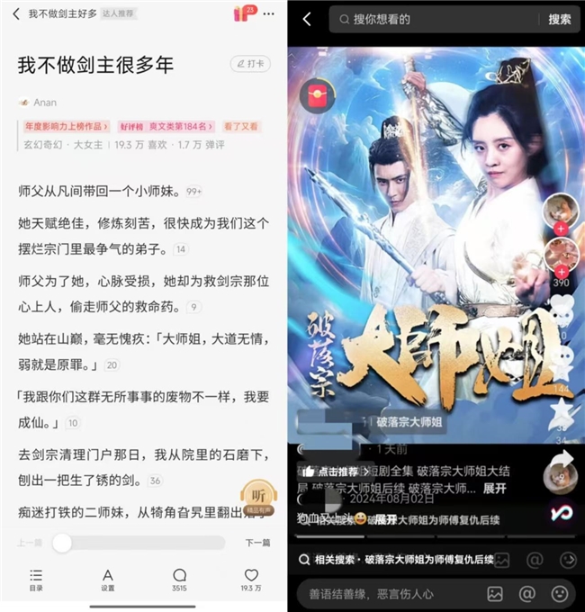 據(jù)了解,目前鹽言故事發(fā)起的短劇侵權訴訟中,已有超過10起案件完成立案,進入法律程序。其中在多平臺播放的付費短劇《破落宗大師姐》,涉嫌重度抄襲鹽言故事作品《我不做劍主很多年》,獲取大量商業(yè)收益,鹽言故事已向該劇制作方及發(fā)行方發(fā)起起訴,案件將于2025年7月在杭州正式開庭審理。這起訴訟,也獲得當?shù)胤ㄔ旱母叨戎匾?有望成為網(wǎng)絡文學與短劇之間,跨媒介內(nèi)容侵權的代表案例。