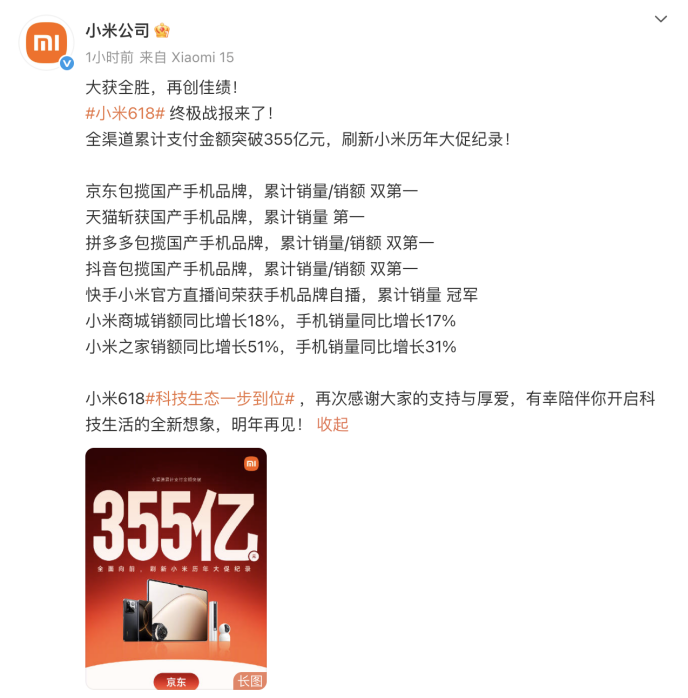 速途網(wǎng)6月19日訊(報道:喬志斌)今日,小米發(fā)布2025年618大促最終收官戰(zhàn)報。截至6月18日23:59:59,小米全渠道累計支付金額突破355億元,刷新小米歷年大促紀(jì)錄,再創(chuàng)新高。手機品類全面霸榜,包攬京東、天貓、拼多多、抖音等電商平臺國產(chǎn)手機品牌銷量第一,小米15獲得京東平臺4000-5999元價位段國產(chǎn)手機銷量第一,REDMI K80摘得京東、拼多多、抖音、快手2000-2999元價位段國產(chǎn)手機銷量冠軍,并獲得天貓國產(chǎn)手機熱賣榜第一。