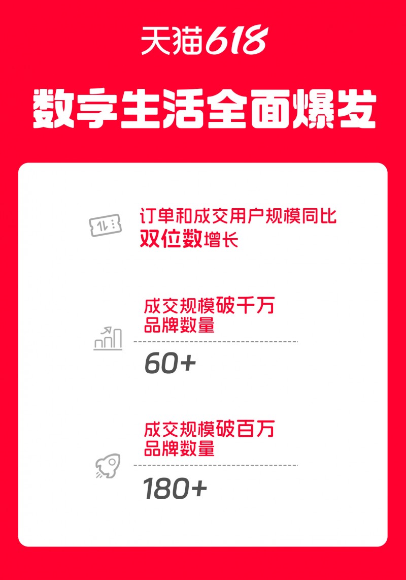數據顯示,數字生活行業訂單和成交用戶規模同比去年實現雙位數增長。5個品牌成交規模破億,同比去年實現超雙位數增長;超60家品牌成交規模破千萬,超180家品牌成交規模破百萬,數量均超過去年,展現出強勁的市場活力。