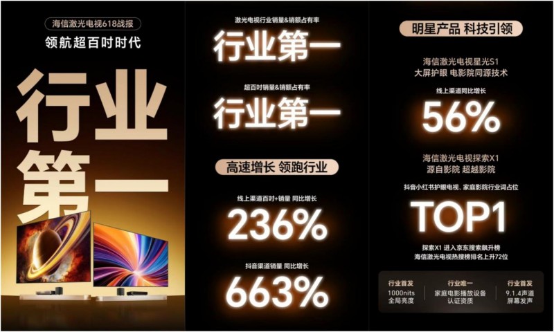 硬核激光顯示技術與AI智控交互的軟實力深度融合,其產生的強大勢能在剛剛落幕的618年中大促中,得到了市場的熱烈回應與充分驗證:海信激光電視一舉登頂行業銷量與銷額占有率榜首,同時在超百吋大屏領域,其銷量與銷額占有率也高居行業第一。 其中,線上渠道百吋以上銷量同比增長236%,抖音渠道銷量更是實現了爆發式的663%同比增長。