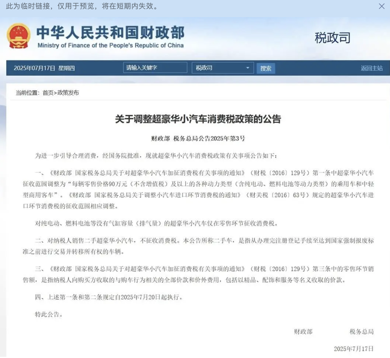 7月17日,財(cái)政部、稅務(wù)總局發(fā)布《關(guān)于調(diào)整超豪華小汽車消費(fèi)稅政策的公告》,哪些超豪車將受到影響?終端市場又在如何應(yīng)對?