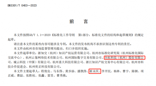 浙江《數(shù)據(jù)知識(shí)產(chǎn)權(quán)交易指南》的起草,由浙知交(杭州)知識(shí)產(chǎn)權(quán)運(yùn)營(yíng)有限公司、杭州市標(biāo)準(zhǔn)化研究所、全拓科技(杭州)股份有限公司(以下簡(jiǎn)稱“全拓?cái)?shù)據(jù)”)等多家單位聯(lián)合。其中全拓?cái)?shù)據(jù)創(chuàng)始人兼董事長(zhǎng)崔永慶,也作為本文件主要起草人,深度參與了《數(shù)據(jù)知識(shí)產(chǎn)權(quán)交易指南》的起草工作。