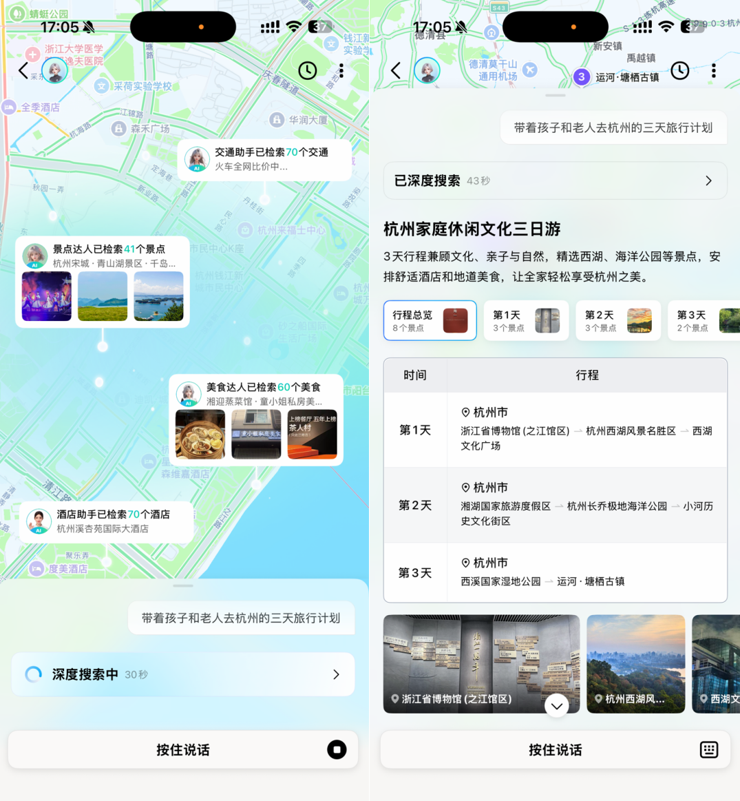 例如用戶可以用語音向小高老師提問:“帶著孩子和老人去杭州的三天旅行計劃”。小高老師就能精準解析需求,基于模型能力推理思考后調用出行服務子智能體,將完整解決方案提供給用戶,用選擇相應目的地后即可一鍵查看路線,導航前往。