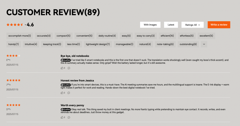 同時,借助SHOPLINE“商品評價”插件,將商品使用評價直觀呈現在商品詳情頁,按清晰的標簽分類,呈現優質評價。
