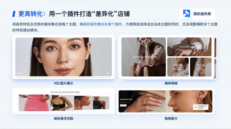 SHOPLINE為商家提供「高階組件庫」,將特色與優勢模塊集合于單一插件。iFLYTEK靈活選用并跨主題組合多樣建站模塊,實現真正的個性化與差異化裝修。