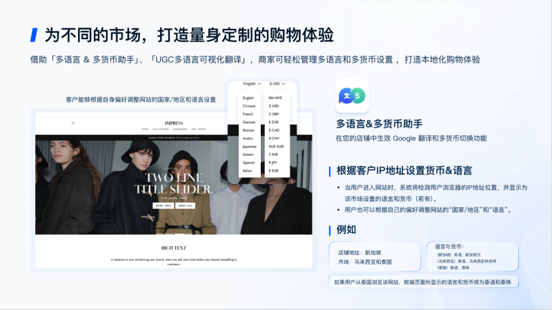 SHOPLINE的多市場解決方案能幫助商家在同一個站點內完成識別、設置、推出、優化和管理國際市場等任務,輕松管理多語言和多貨幣設置,以更加本地化的方式(國際域名,多語言、多幣種)進行銷售,提高各國市場的交易轉化率,實現一店賣全球。