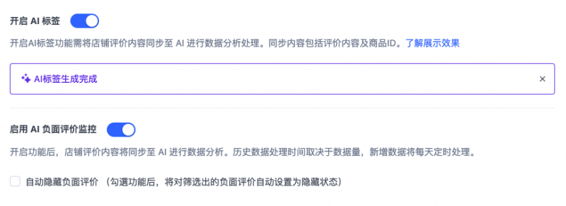 值得一提的是,SHOPLINE獨家支持商家一鍵開啟AI評價標簽,還可以啟用AI負評監控,并對惡意評價自動進行隱藏,這些真實的消費者聲音極具說服力,是轉化的重要推力,同樣品牌口碑穩定的關鍵保障。