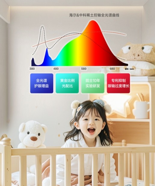 據了解,稀土護眼燈珠是中科院士團隊從2012起,集合多院所跨學科團隊力量,聯合開展的“光對視力及腦高級功能的影響研究”項目的核心成果。項目經過10余年獼猴實驗的研究及人因測試,結果表明:高色溫(4000K及以上)光源會誘導眼軸伸長,2700~3000K低色溫特定光源可有效抑制眼軸增長。而海爾天沐系列護眼燈所使用的燈珠正是能有效抑制眼軸過度增長的稀土護眼燈珠。