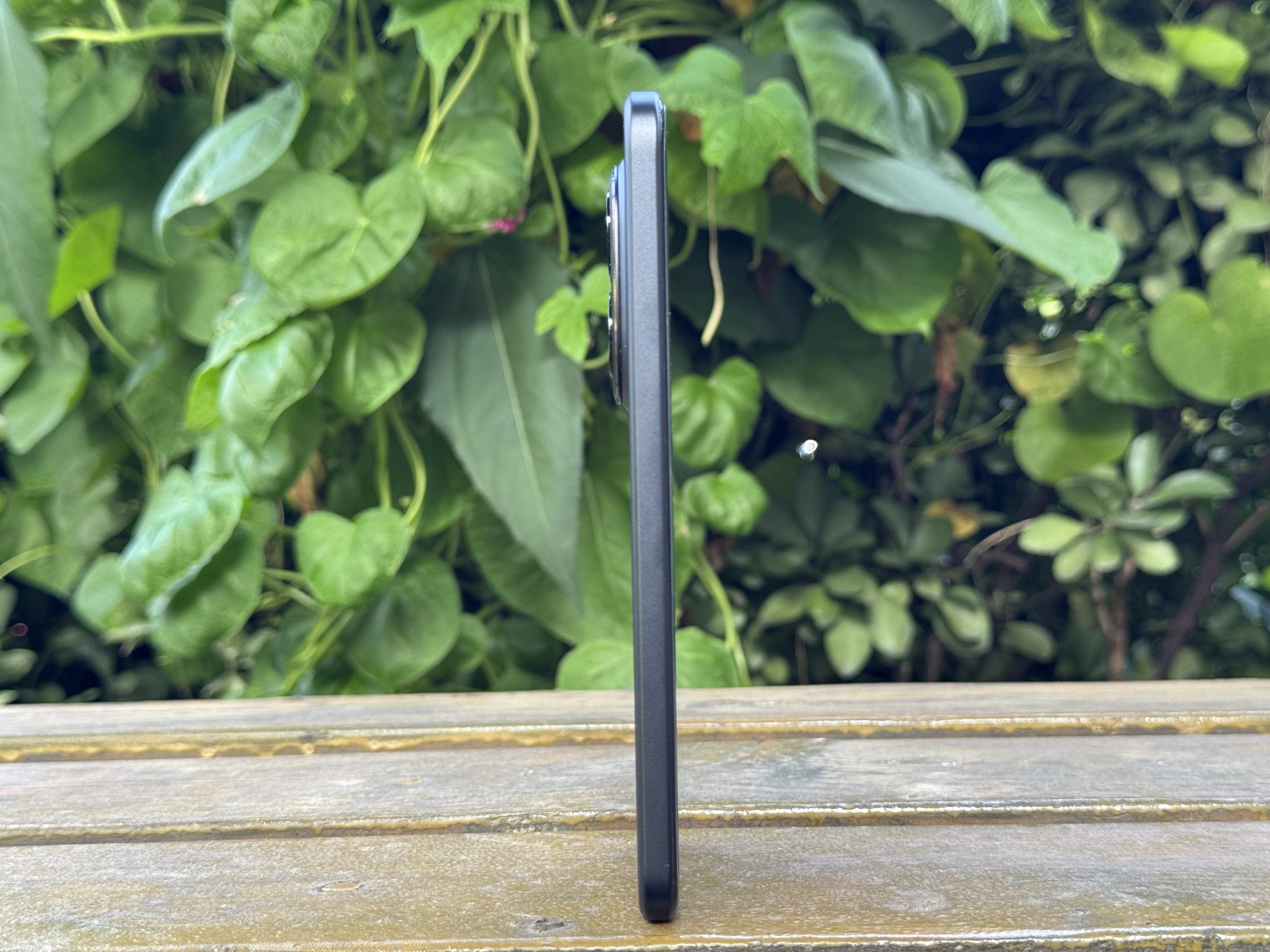 我們拿到的這臺是“子夜黑”配色,背部采用玻璃纖維后蓋,在讓機身更加輕薄的同時,機身背部的相機模組采用了全新的“火山口” 設計,居中對稱的四炮筒造型極具辨識度,金屬鏡頭環的點綴更添幾分精致感,寓意著破土而出的生命力。