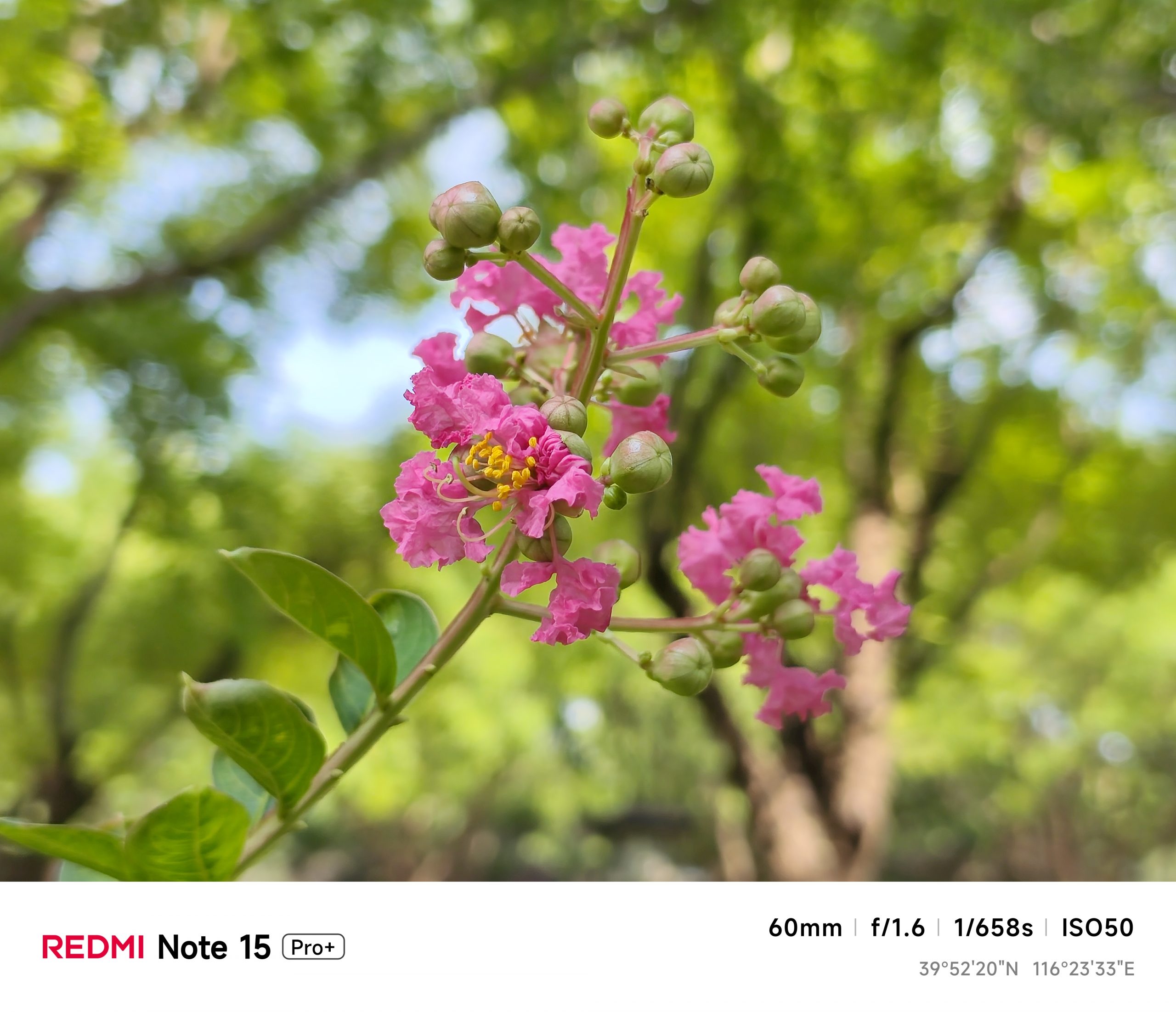這顆主攝擁有 1/1.55″ 的大底,支持 OIS 光學防抖,但其真正的“殺手锏”是支持雙原生 ISO Fusion Max 技術。這意味著傳感器可以同時以高、低兩檔 ISO 進行曝光并融合輸出,從而獲得高達 13.2EV 的超高動態范圍。配合一顆 5000 萬像素、支持 2.5X 光學變焦的人像長焦鏡頭,以及一顆 800 萬像素的超廣角鏡頭,Note 15 Pro+ 借助 In-sensor Zoom(傳感器內變焦)技術,實現了 0.6X、1X、2.5X、5X(等效焦段 15mm-120mm)的無損級五焦段拍攝能力,同時主攝與長焦鏡頭在亮度、白平衡、色彩還原等方面保持了出色的一致性。
