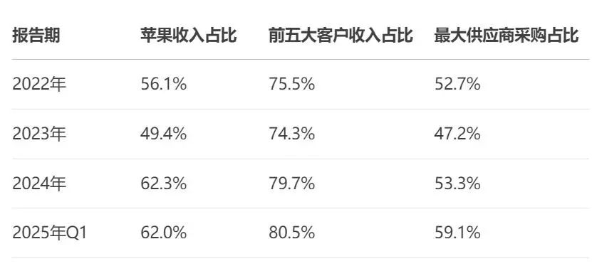 然而,這種聯動也暗藏風險。歌爾股份2025年一季度負債率達56.05%,貨幣資金217.44億元看似充裕,卻需覆蓋短期借款、應付賬款等剛性支出,95億元收購可能加劇資金鏈壓力。更關鍵的是,收購標的與蘋果的深度綁定,將使歌爾系企業整體對蘋果的依賴度進一步上升,一旦蘋果調整供應鏈,風險將成倍放大,且與歌爾微試圖通過IPO展現“獨立性”的訴求形成矛盾。