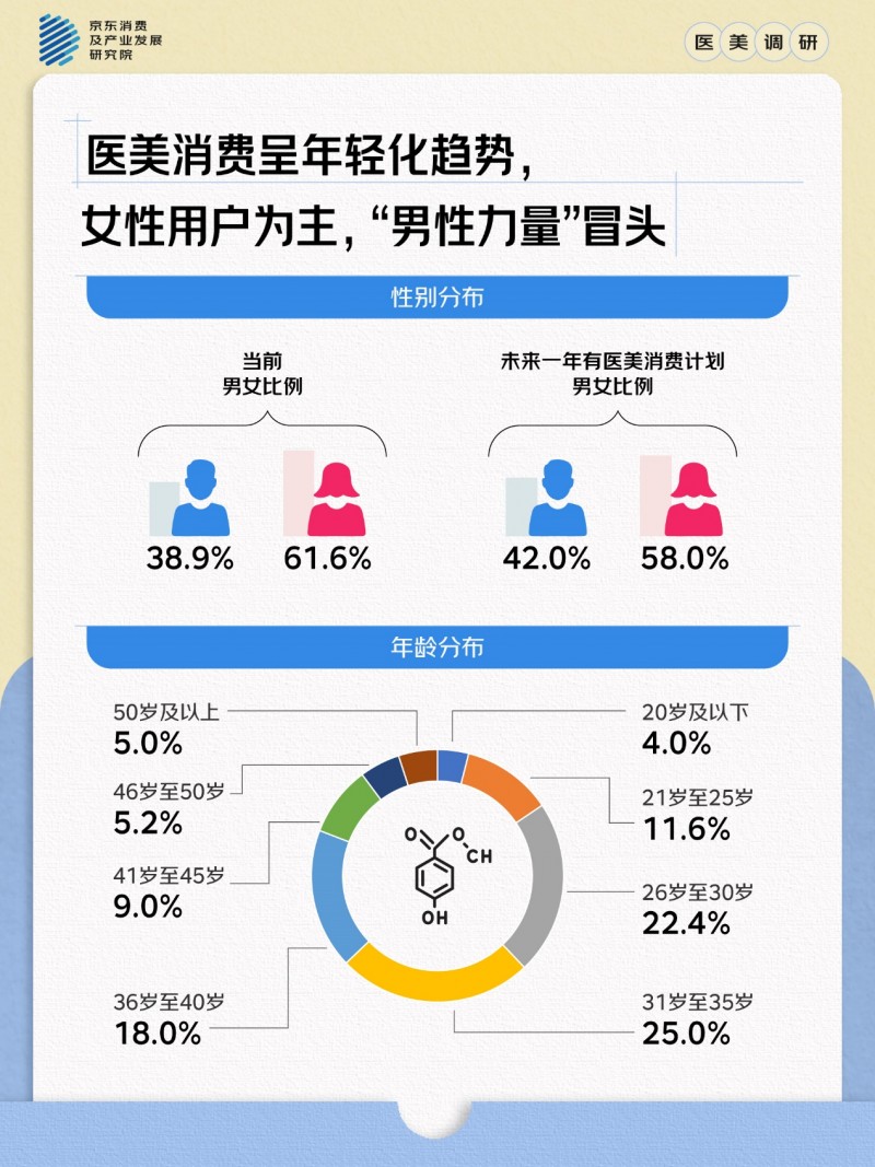 對于已經(jīng)步入社會的年輕人來說,不僅思維活躍、善于接受新鮮事物,同時更是“悅己”人生態(tài)度的忠實擁躉,對自身形象有著更高的要求,這也促使她們更早地開始關注和嘗試醫(yī)美項目。25歲的插畫設計師佳佳的經(jīng)歷很有代表性:“去年第一次嘗試光子嫩膚,今年加了頸紋針,還在慢慢探索適合自己的項目。”這種漸進式消費模式正在成為主流,顯示出年輕消費者對醫(yī)美采取的是試水心態(tài)而非“all in”,她們更愿意通過小步快跑的方式找到適合自己的方案。京東健康體檢中心(亦莊店)醫(yī)療美容科相關負責人也表示,目前抗衰需求升級,已經(jīng)從“特定人群”擴展到“泛人群”,不再局限35+人群,25歲至30歲“初老預防”群體占比在提升。