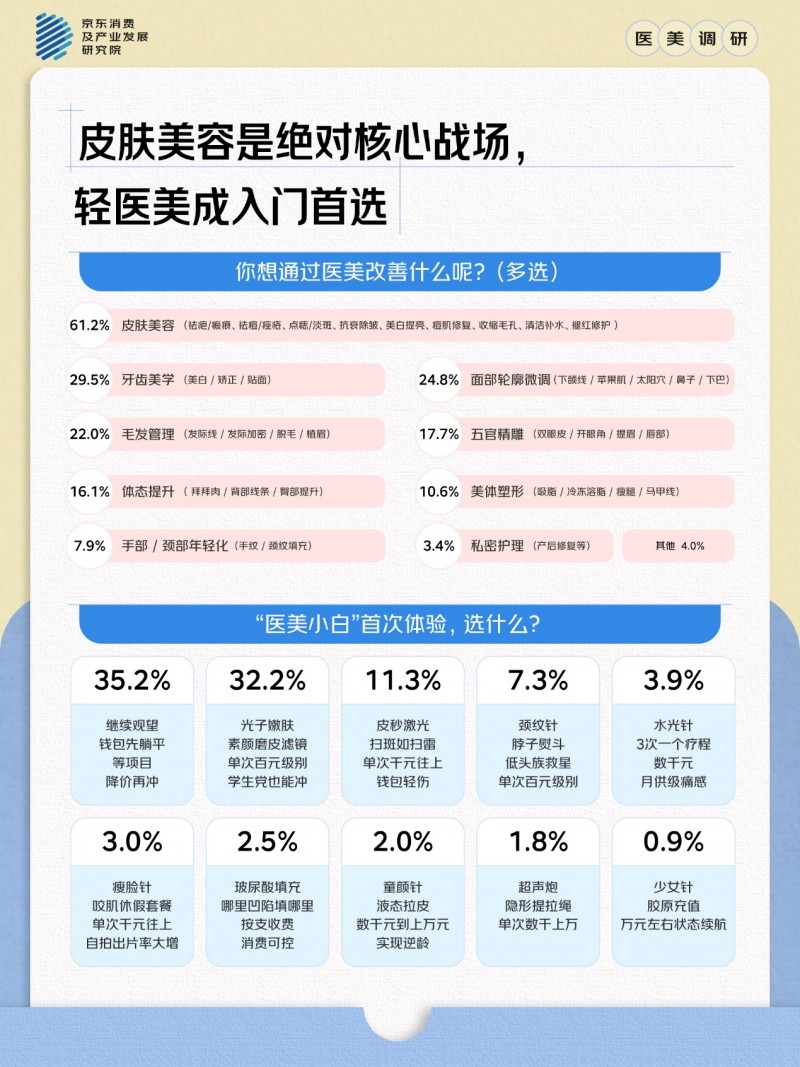 醫(yī)美消費中,輕醫(yī)美是主流選擇,皮膚管理需求居榜首。43%消費者首要改善膚質(zhì)問題,牙齒調(diào)整(28.6%)、皮膚瑕疵(24.3%)及頭發(fā)問題(21%)緊隨其后。32.2%新手首選光子嫩膚。低風險、高性價比項目受青睞,61.2%需求聚焦皮膚美容,消費偏好日常保養(yǎng)而非“改造”。