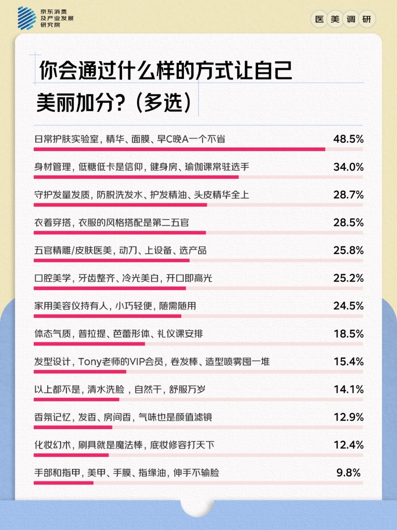 同時,人們對自身容貌的高滿意度并不意味著對美的追求止步不前,恰恰相反,越來越多的人開始通過護膚、健身、低GI飲食、服飾穿搭等多元化手段實現(xiàn)全方位的美麗加分。48.5%的人堅持“精華、面膜、早C晚A”的精細化護膚,34%將“低糖低卡+健身房打卡”的身材管理列為日常,28.7%為守護發(fā)量配齊防脫洗發(fā)水與頭皮精華,28.5%通過穿搭打造“第二五官”,18.5%通過普拉提、芭蕾形體提升體態(tài)氣質(zhì)。