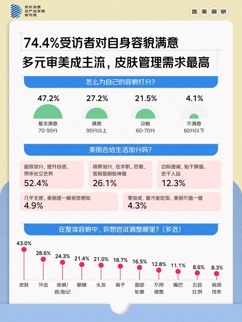 74.4%受訪者對自身容貌滿意,多元審美成主流,皮膚管理需求最高