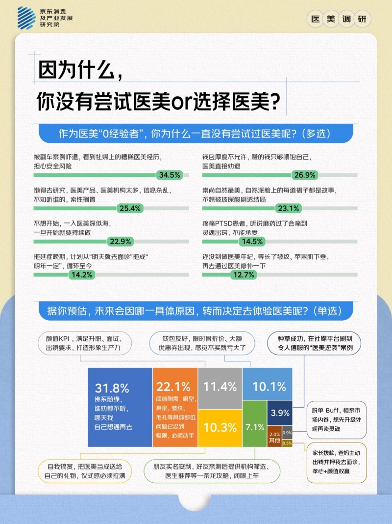 “很多人混淆了生活美容和醫(yī)療美容,部分消費者誤以為醫(yī)美等同于普通美容護理” ,京東健康體檢中心(亦莊店)醫(yī)療美容科相關負責人表示,權威科普信源缺乏,社交媒體上的信息對消費者的影響很大。在此背景下,25.4%的人因“認知成本”過高而放棄嘗試醫(yī)美,他們表示,“懶得去研究,醫(yī)美產(chǎn)品、醫(yī)美機構太多,信息雜亂,不知聽誰的,索性擱置”,此外,26.9%的人被價格勸退,他們因“錢包厚度不允許”而放棄,這在學生群體和初入職場的年輕人中尤為突出,還有23.1%的人因崇尚自然美而止步,14.5%的人因為怕痛不敢開始。