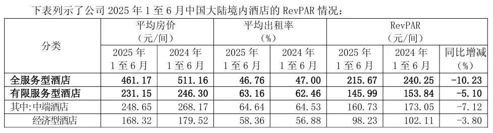 2025年上半年,錦江酒店境內酒店的RevPAR均同比下降。其中,全服務型酒店RevPAR為215.67元,同比減少10.23%;有限服務型酒店的RevPAR為145.99元,同比減少5.1%。此外,全服務型酒店的日均房價為461.17元,同比下降9.78%;有限服務型酒店的日均房價為231.15元,同比下降6.15%。這意味著,錦江酒店在“價”與“量”上均失去增長動能。