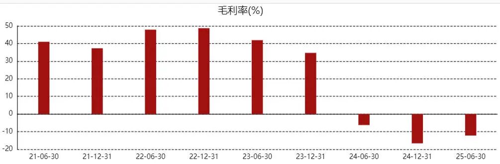 在收入規模收縮的同時,協鑫科技的盈利能力也在加速惡化。2025年上半年的毛虧損從去年同期的5.53億元擴大至7億元,同比增加26.7%;整體毛利率則從去年同期的-6.2%進一步下滑至-12.2%,陷入“賣得越多、虧得越多”的成本倒掛困境。