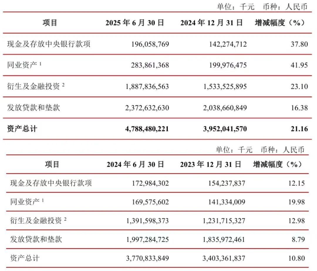 財報顯示,2025年上半年末,江蘇銀行的衍生及金融投資余額為18878億元,較去年同期的13916億元增長35.66%,占總資產(chǎn)的比重約為39.42%;同業(yè)資產(chǎn)為2839億元,較去年同期的1696億元增長67.39%,占總資產(chǎn)的比重約為5.93%。