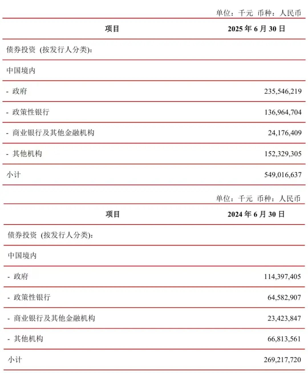 財報顯示,“其他債權投資”按發(fā)行人分類中,境內其他機構債券由2024年上半年的668億元增至今年上半年的1523億元,同比增長128%;同期,境內政府債券由1144億元增至2355億元,同比增長106%?!捌渌麢C構”是指除政府、政策性銀行、商業(yè)銀行及其他金融機構外的發(fā)債主體,主要包括企業(yè)和融資平臺等。