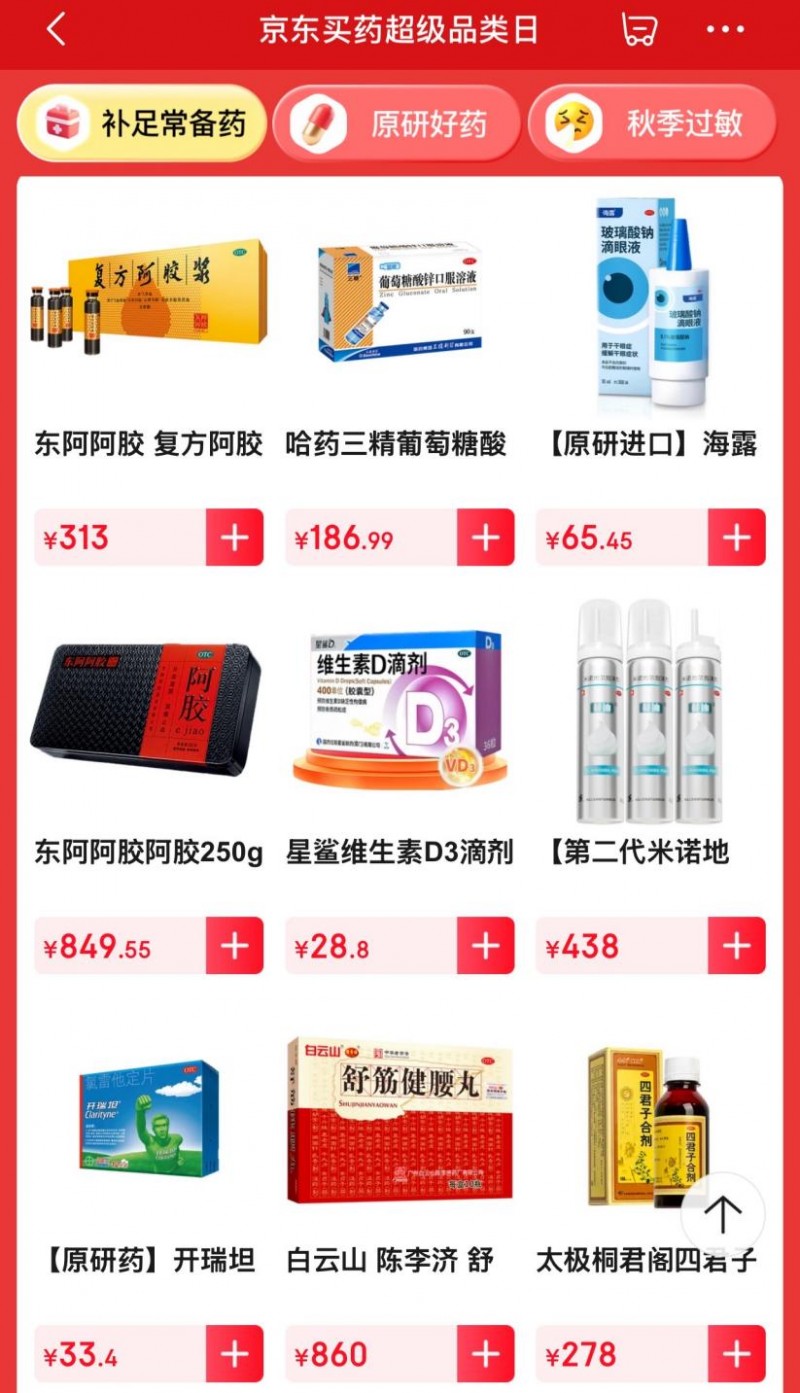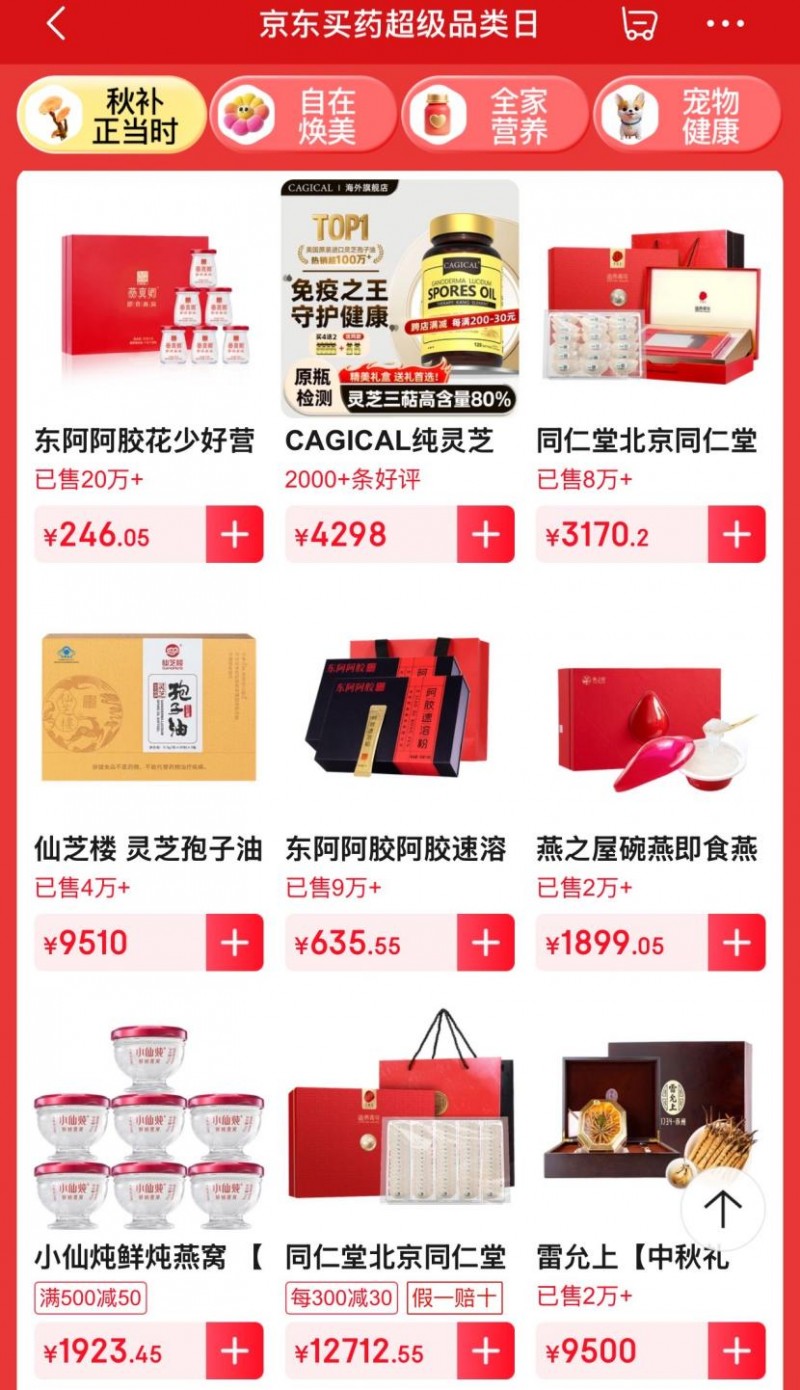 針對熬夜、壓力大、體虛畏寒等典型場景,京東買藥匯聚燕窩、阿膠、參茸、養生茶飲和靈芝孢子粉等高端滋補品,同時引入輔酶Q10、魚油、抗氧化膠囊等現代營養制劑,滿足年輕人“一邊耗一邊補”“精準養護”的需求。