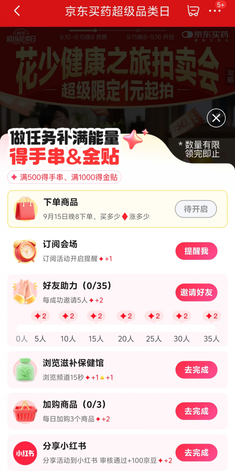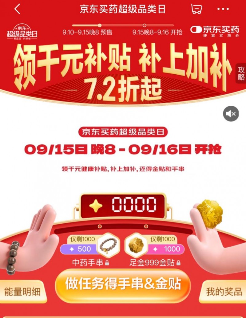 為了滿足大家“邪修”養生的需求,京東買藥9月15日晚8點-9月16日的超級品類日活動,推出千元健康補貼,以及7.2折起等優惠,健康好物覆蓋秋季進補、換季防護、中秋送禮等多場景的健康需求。不僅如此,用戶來到活動會場,完成指定任務即可領取金貼與健康手串等驚喜好禮,實現從身體到心理、從產品到體驗的全方位進補。