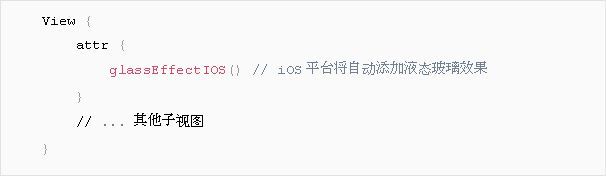 Kuikly在API設(shè)計(jì)上同樣追求簡(jiǎn)潔與高效。對(duì)于常用的`View`、`Button`等組件,為了適配“液態(tài)玻璃”,我們沒(méi)有引入新的獨(dú)立組件,而是為現(xiàn)有組件提供了簡(jiǎn)潔的視圖屬性擴(kuò)展。例如,開(kāi)發(fā)者只需通過(guò)一行 `glassEffectIOS()` 代碼,即可為任意容器視圖啟用液態(tài)玻璃效果。