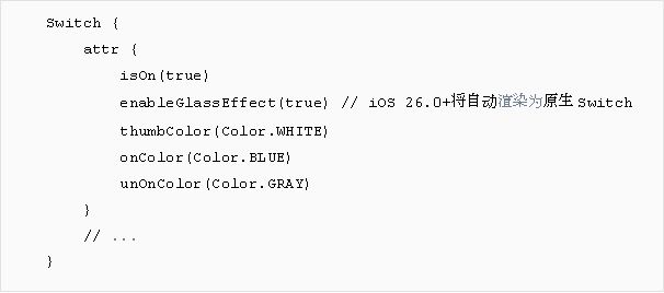 ? iOS特有組件: 對(duì) `Slider` 和 `Switch` 這類(lèi)在iOS 26上擁有全新動(dòng)態(tài)效果的控件,我們?cè)阡秩緦有略隽薸OS平臺(tái)專(zhuān)屬的組件進(jìn)行封裝,這確保了這些控件在具備液態(tài)玻璃效果的同時(shí),能夠獲得與原生完全一致的交互體驗(yàn)。在上層DSL使用上,我們封裝了平臺(tái)差異,開(kāi)發(fā)者無(wú)需修改原有組件的使用代碼,只需添加 `enableGlassEffect(true)` 屬性,即可輕松啟用。