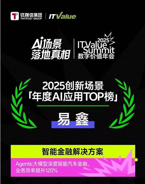 近日,IT Value Summit數字價值年會正式發布“創新場景50”2025年度榜單。易鑫憑借其在汽車金融領域的AI研發及場景落地成果,入選“2025創新場景[年度AI應用TOP榜]”,成為登榜的唯一一家汽車金融領域科技企業。