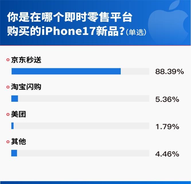 線上渠道主導市場,79.98%用戶通過線上購買iPhone 17系列,其中72.83%選擇了京東,與淘寶/天貓(9.28%)、Apple Store(6.24%)等平臺拉開較大差距;線下門店和即時零售購入新機的用戶則分別占比13.21%和6.82%;在即時零售領域,88.39%用戶首選京東秒送。
