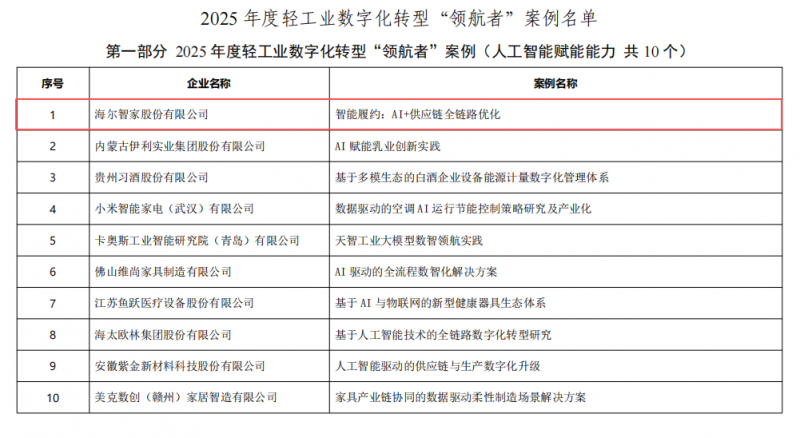 現場,中國輕工業信息中心發布了2025年度輕工業數字化轉型“領航者”案例名單,海爾智家憑“智能履約:AI+供應鏈全鏈路優化”上榜,并位居人工智能賦能方向榜首。
