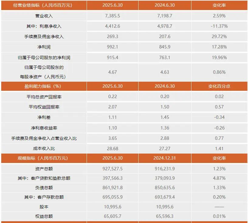 財報顯示,2025年上半年哈爾濱銀行實現營業收入73.86億元,同比增長2.59%;歸母凈利潤為9.15億元,同比增長19.96%。截至6月末,資產總額為9275.28億元,較上年末增加1.23%。