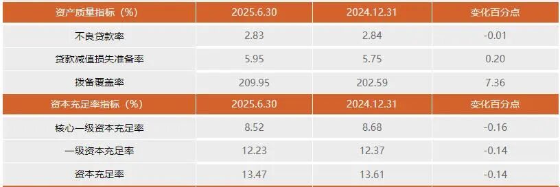 資產質量的持續惡化會傳導至資本實力層面。截至2025年6月末,哈爾濱銀行的核心一級資本充足率、一級資本充足率、資本充足率分別為8.52%、12.23%、13.47%,較上年末分別下降0.16個百分點、0.14個百分點、0.14個百分點。其中,核心一級資本充足率距離7.5%的監管紅線僅余1.02個百分點的安全邊際。