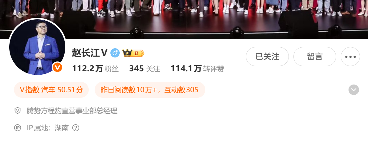 目前,智界的官方信息由“智界汽車”與“智界海藍天”對外發(fā)布,其中海藍天為智界產(chǎn)品總監(jiān),微博粉絲10.2萬,從影響力的角度來說,前榮耀CEO趙明與比亞迪騰勢方程豹直營事業(yè)部總經(jīng)理趙長江影響力顯然更勝一籌,前者微博粉絲382.4萬,后者112.2萬。