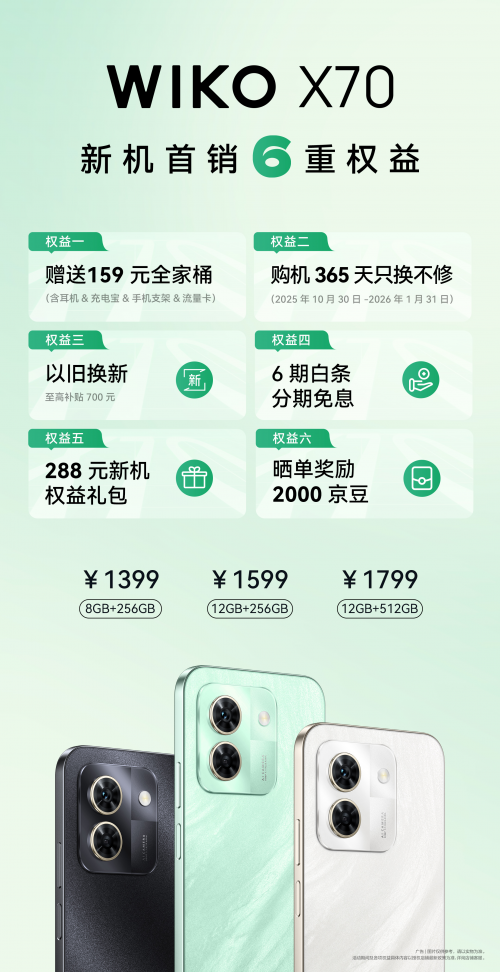 當前入手WIKO X70可享多重重磅福利:機型零售價1399元起,新品開售階段同步推出6重權益禮包:耳機充電寶等159元全家桶、365天只換不修、至高補貼700元以舊換新、6期白條分期免息、288元新機權益禮包及曬單領2000京豆。其中,“365 天只換不修”帶來更安心的保駕護航體驗:一年內若出現質量問題,無需維修即可直接更換新機,相較行業常規保修服務更顯貼心。